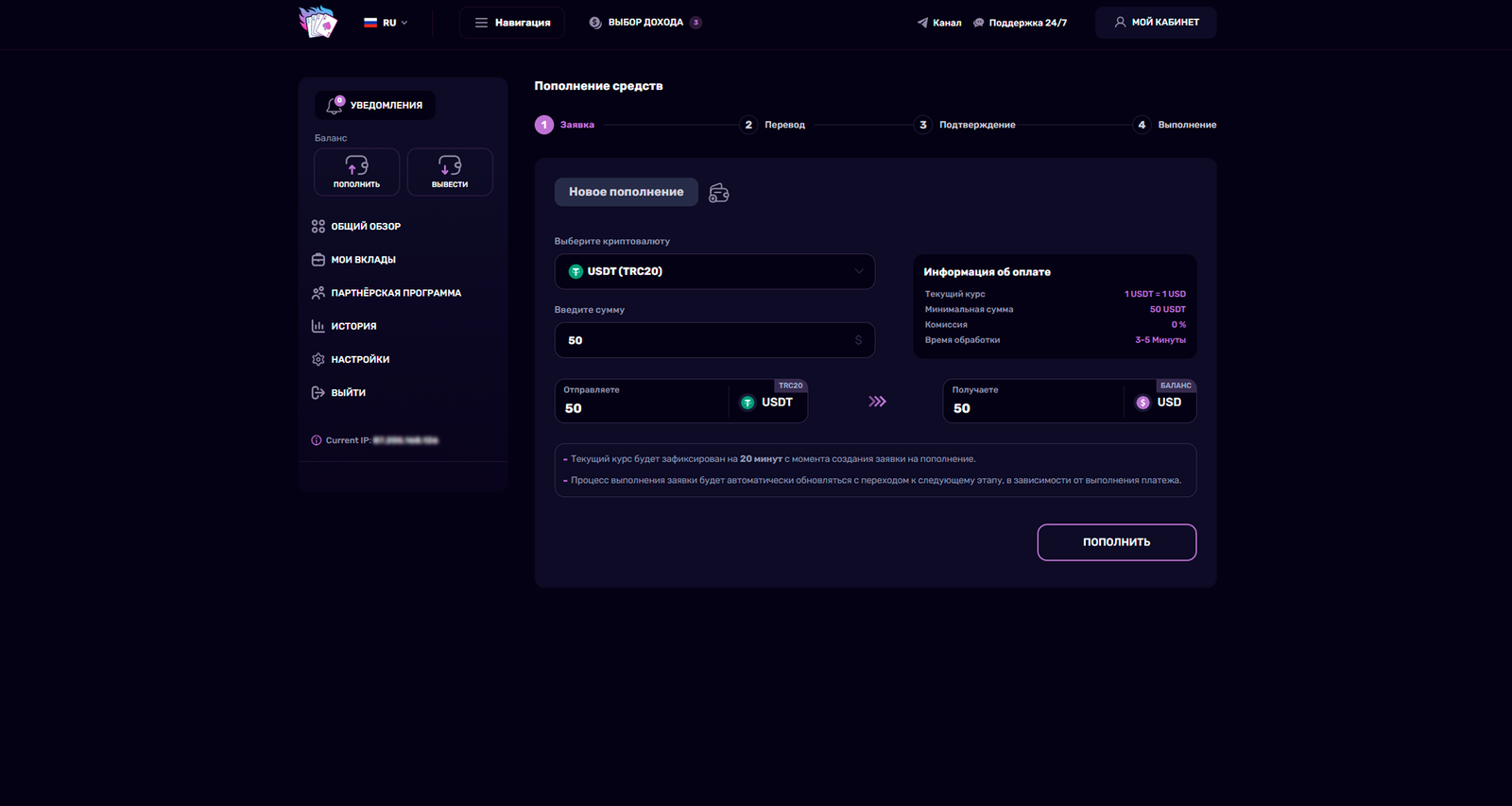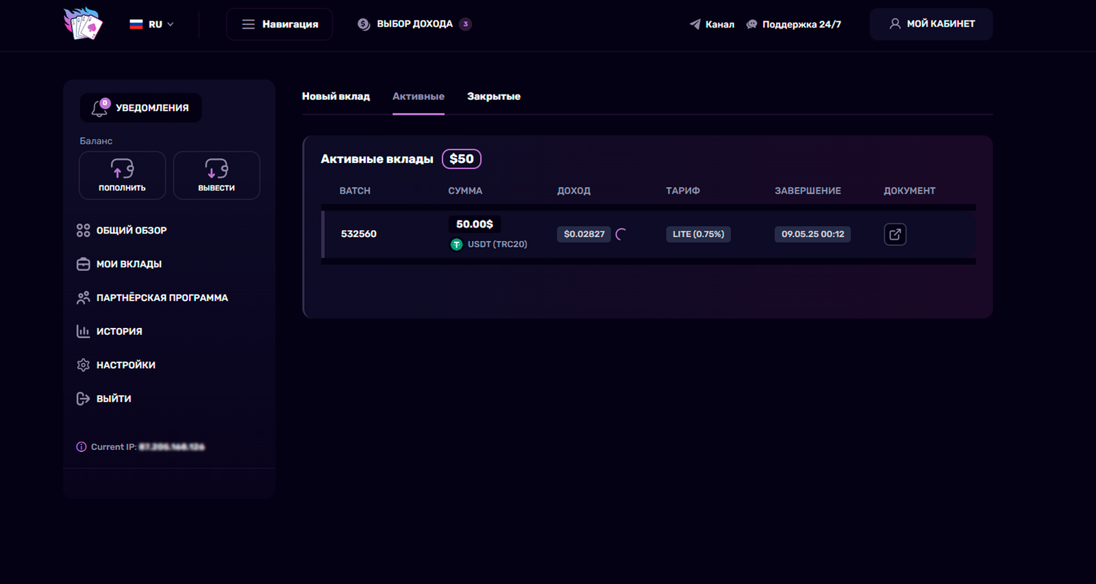 После выбора тарифа, пополнения счета, и размещения вклада инвестору остается наблюдать за тем, как начисляется доход от инвестиций и вознаграждения в рамках Партнерской программы.