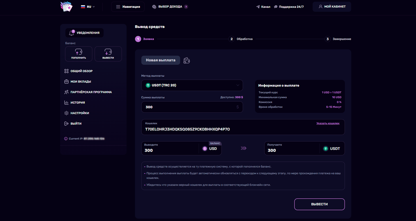 Платформа Join Staking предоставляет возможность выводить накопленные средства разными способами. Заявки на перевод выполняются мгновенно. Выводить прибыль можно только тем же способом, который использовался для пополнения баланса.